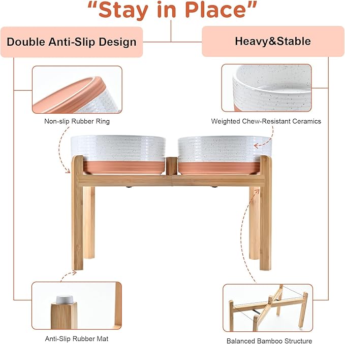 - Stable, Tip‑Resistant Design – A solid bamboo frame with Chew‑Resistant Heavyweight Ceramic, wide stance, and slip‑proof silicone pads join forces to create raised dog bowls that STAY IN PLACE on tile, wood, or laminate. Fewer spills mean cleaner floors and no accidental gouges or scratches or noisy