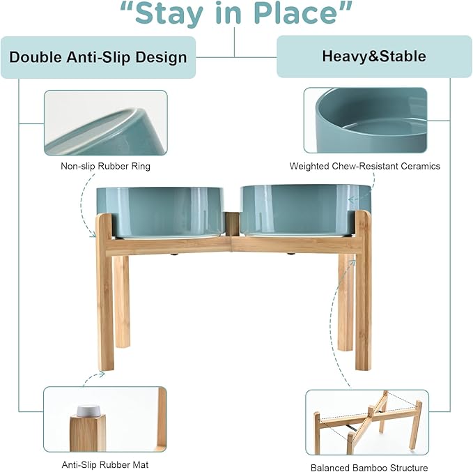 - Stable, Tip‑Resistant Design – A solid bamboo frame with Chew‑Resistant Heavyweight Ceramic, wide stance, and slip‑proof silicone pads join forces to create raised dog bowls that STAY IN PLACE on tile, wood, or laminate. Fewer spills mean cleaner floors and no accidental gouges or scratches or noisy