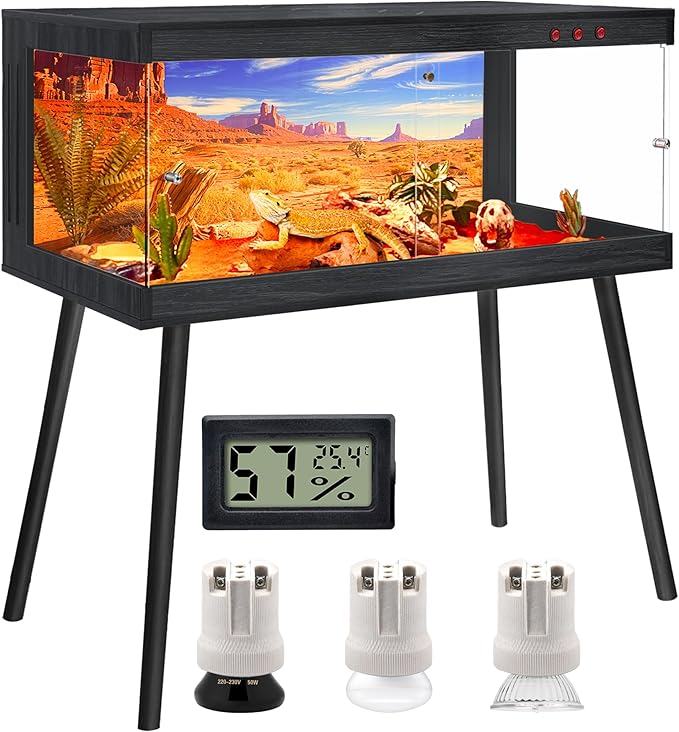 - 【Premium Build & Materials】Expertly crafted with natural wood and tempered glass, this terrarium features a waterproof coating for long-lasting use and a clean, modern aesthetic. The acrylic bottom panel provides reliable moisture resistance, protecting the enclosure from spills and substrate buildup. Its spacious interior allows your reptile to explore, bask, and hide comfortably—encouraging natural behaviors and supporting overall wellness. Available in 4 size options, each unit includes 4 legs; see image 3 for detailed dimensions.