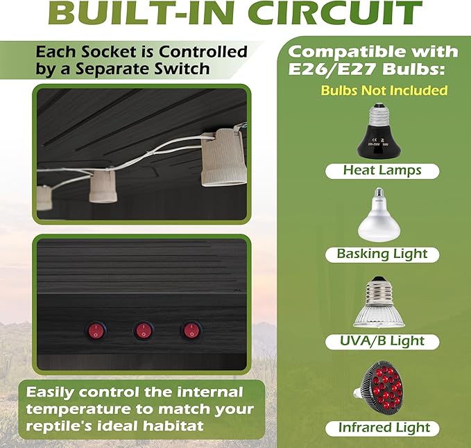 - 【Built-In Lighting System】The integrated electrical system includes built-in lamp holders—2 holders for 24"/32" models and 3 for 40"/48" models—each equipped with its own independent switch, saves money setting up the light fixture. Compatible with standard E26/E27 bulbs (not included), this setup gives you full control over lighting and temperature to create the perfect environment for your reptile's specific needs, and say goodbye to tangled wires, one wire controls the whole cage.