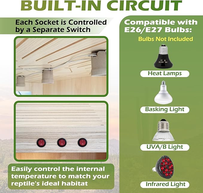 - 【Built-In Lighting System】The integrated electrical system includes built-in lamp holders—2 holders for 24"/32" models and 3 for 40"/48" models—each equipped with its own independent switch, saves money setting up the light fixture. Compatible with standard E26/E27 bulbs (not included), this setup gives you full control over lighting and temperature to create the perfect environment for your reptile's specific needs, and say goodbye to tangled wires, one wire controls the whole cage.