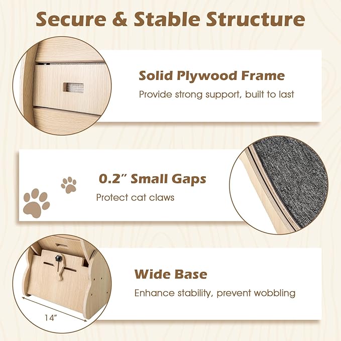 - Secure and Stable Structure: Built with a solid plywood frame and supported by a 14” wide base, this wooden cat running wheel provides extraordinary stability and is built to last. Furthermore, the 0.2” small gaps between the base and the wheel prevent paws from getting stuck, ensuring safety.