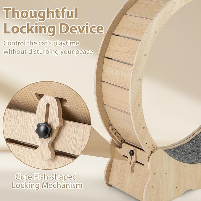 - Thoughtful Locking Device: This cat running treadmill comes with a cute fish-shaped locking mechanism. This design allows you to pause the wheel during rest hours or when unsupervised, ensuring quiet nights and undisturbed peace.