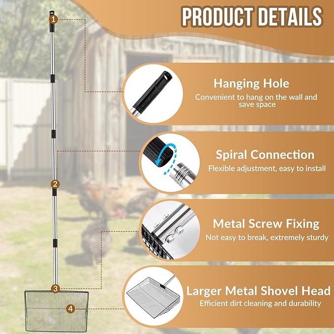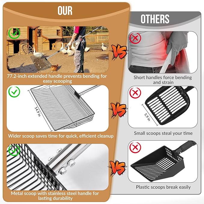 - 15-Inch Wide Scoop --- Our chicken coop scoop comes with an extra-wide 15-inch (38cm) head, covering twice the area of traditional tools for faster cleaning in chicken coops, cattle sheds, and goat pens. The shovel surface is designed with 0.2 inches (6mm) filter slits, which can accurately intercept manure particles with a diameter of >0.2 inches (6mm), ensuring quick cleaning while leaving useful bedding materials like wood shavings and rice hulls behind.