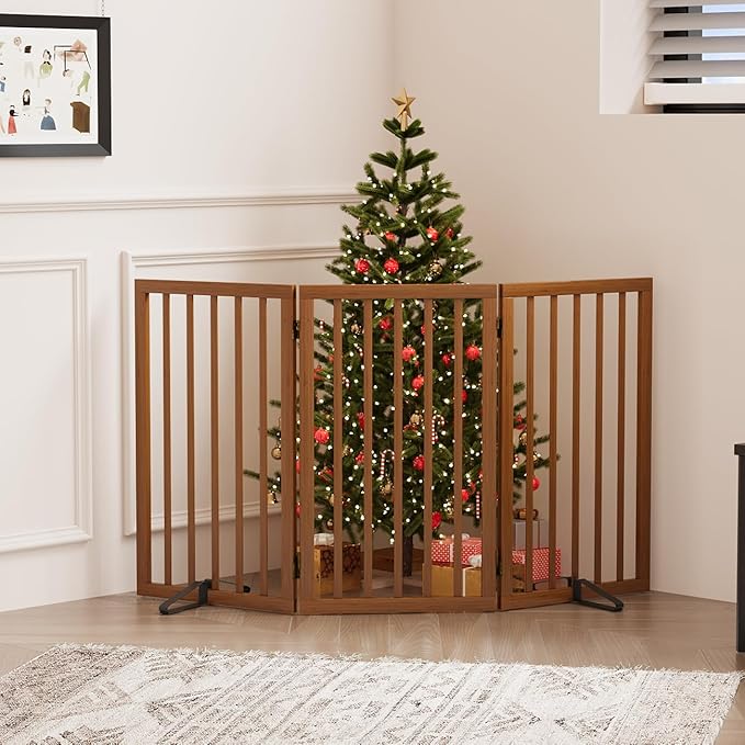 Dog Gates for Doorways, Tall Dog Gate Indoor, Foldable Pet Gates for Doorways Bedroom, Freestanding Puppy Gate with Metal Support Feet, Room Divider,3 Panels (Walnut)