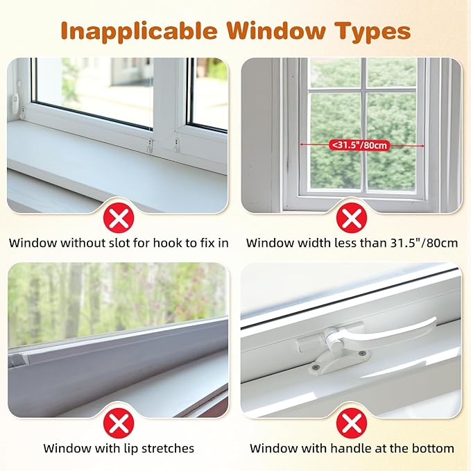 - Applicable Window Type: Before purchasing, make sure to measure the size of the window to ensure compatibility between the window sill and cat perch. <1>There must be a slot greater than 0.08in/0.2cm at the window. <2>The width of the window greater than 31.5in/80cm. <3>The gap between the window slot and the edge of the window sill less than 7.09 in/18cm. <4>Window trim height less than 3.86in/9.8cm. <5>Window edge stretching less than 1.97in/5cm