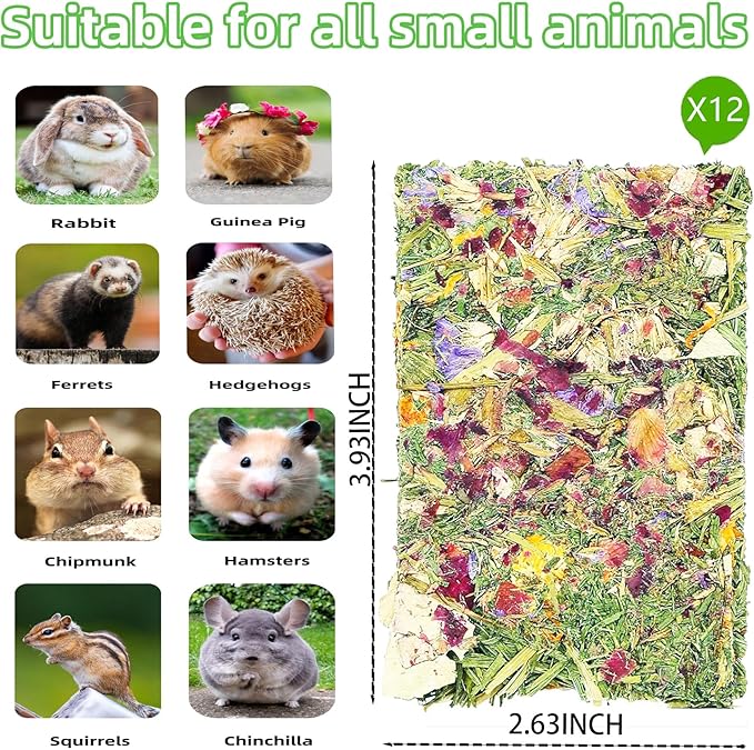 - 【Suitable for Little Animals】: Guinea pig treats is good for your little rodents such as rabbits,bunny, hamsters, gerbils, rat, chinchillas, guinea pigs, squirrels, parrots, chipmunks, hedgehogs and other birds. Timothy hay for rabbit is one of the first choices for rabbit pasture, high fiber, low fat, low calcium, and moderate protein.