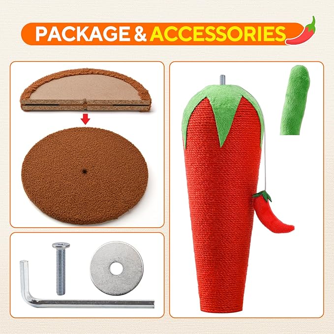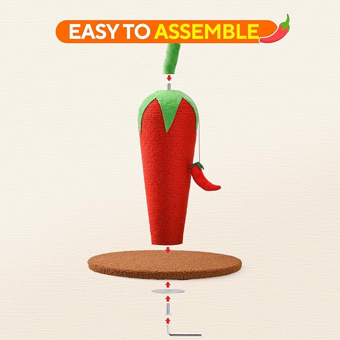 - 【Cute Chili Shape scratch post】This Chili-Shaped cat scratching post with sturdy scratching pole covered with natural sisal standing on the 14’’ round base like a mimic chili looks cute and fresh that help blend into any modern decor and add fun flair to any room. It offers a perfect place for kittens to relieve their stress save your furniture from their clawing.