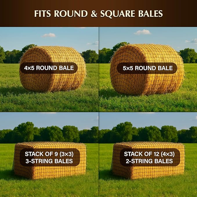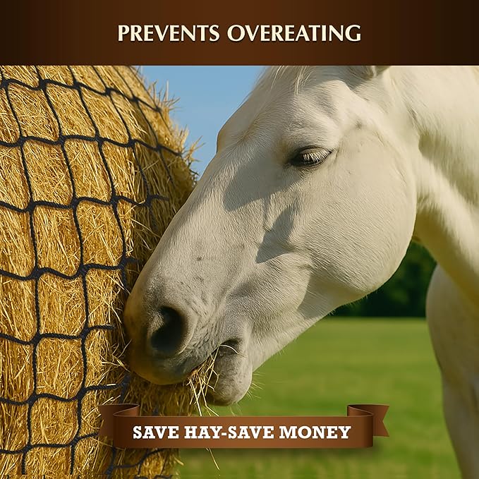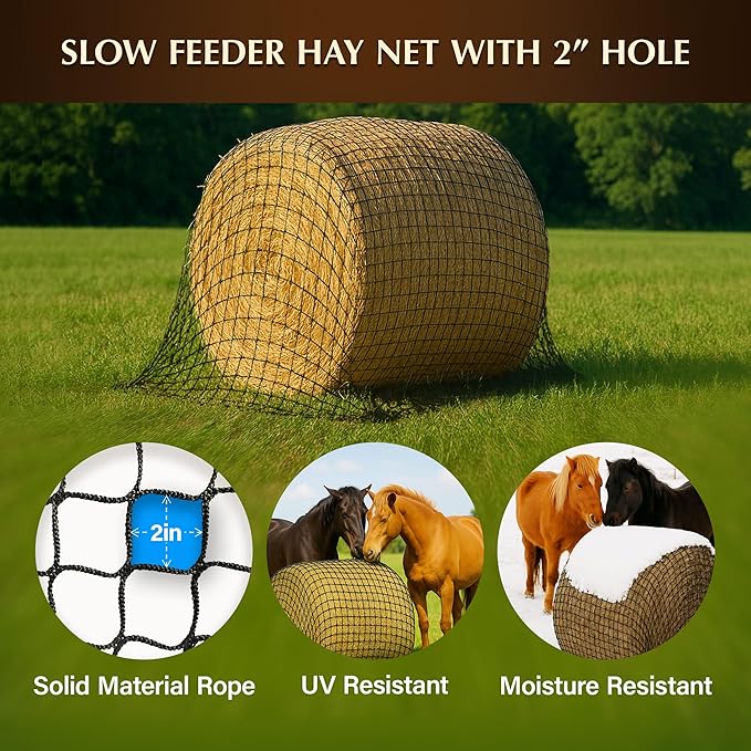 - Round Bale Hay Feeder – Our Hay Bale Net features a 2.0'' cell size and knotless smooth continuous mesh, designed to support slow feeding for horses, cows, and other livestock.