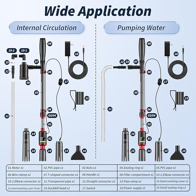 - 【Easy to Use】 The electric fish tank cleaner vacuum saves time and effort over manual water changes and manual tank cleaning. It uses a 4-layer filtration system, When using, hold the handle and press down, water will automatically be sucked into the pipeline and flow out through the hose. It can efficiently filter fish feces and food debris to filter water and circulation in the fish tank. The filter sponge can be washed and reused repeatedly.