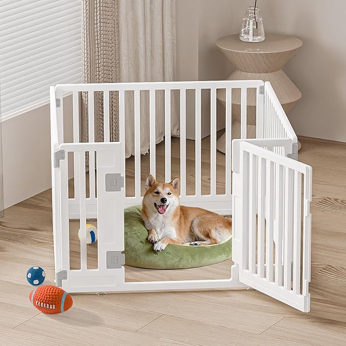 Pet Playpen Foldable Gate for Dogs Heavy Plastic Puppy Exercise Pen with Door Portable Indoor Outdoor Small Pets Fence Puppies Folding Cage 4 Panels Medium Animals House Supplies (PPW-WHITE04, White)