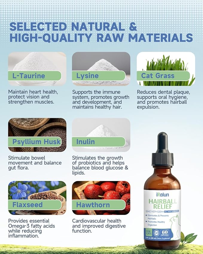 - Quality Ingredients: Our cat hairball drops are made from natural ingredients, with no artificial colours or preservatives. Administer 1–2 drops daily to support your cat’s unique needs. They can be used directly or mixed with food, milk, or water to support your cat’s health from the inside out