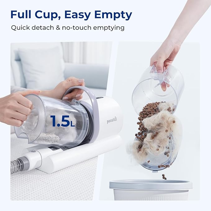 - 【EASY TO DETACH & STORE】Vacuum grooming hose and attachments can be removed with one click, making grooming tool easy to replace. Pet groomer vacuum dustbin uses simple buckle design, smoothly detach, easy to empty and wash. Besides, pecute dog hair vacuum is compact and lightweight, providing separate storage pocket for accessories management, greatly saving space.
