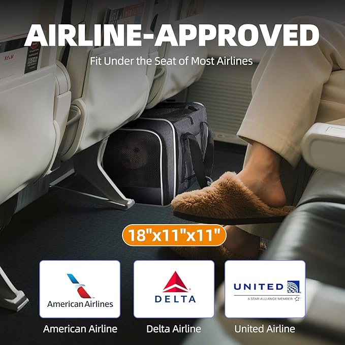 - AIRLINE-APPROVED TSA - 18" x 11" x 11" soft sided pet carrier fits under seats of 3 major U.S. airlines: Delta Airline, United Airline and American Airline, for medium cat up to 20 lbs or small puppy dog up to 12 pounds. We sugguest confirming with the airline before your flight