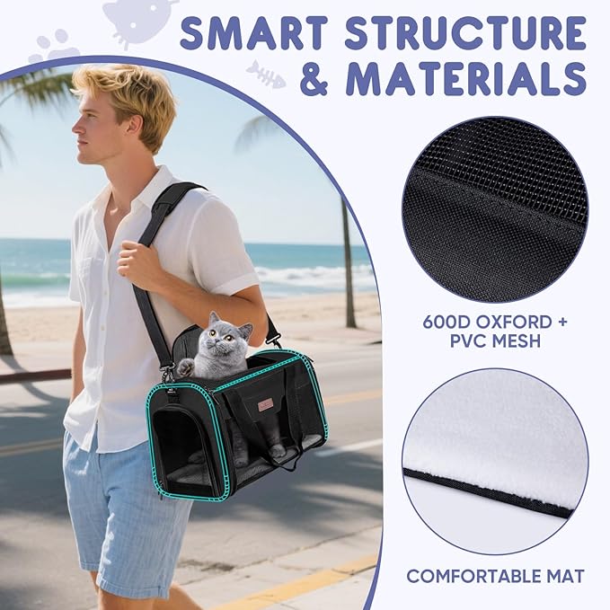 - Durability and Comfort: Made of 600D waterproof fabric and PVC mesh, this pet carrier for cat resists daily wear and scratches from pets; The integrated iron wire and rubber frame maintain its shape even when empty; While the 3mm fiberboard base offers stability, and a removable soft plush mat ensures a comfortable sleeping space for your pet during trips