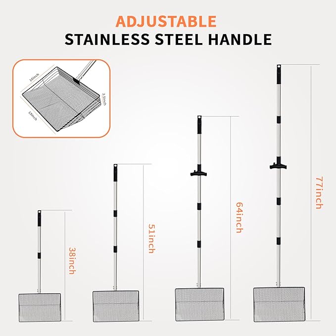 - Adjustable & Durable Stainless Steel Handle: This chicken poop scooper is equipped with a telescoping stainless steel handle that adjusts to four lengths—32", 44", 55", and 67"—for comfortable use in coops of any size. The scoop head is crafted from sturdy iron wire, and the 201 stainless steel handle adds strength and longevity, making it a reliable tool for daily chicken coop cleaning.