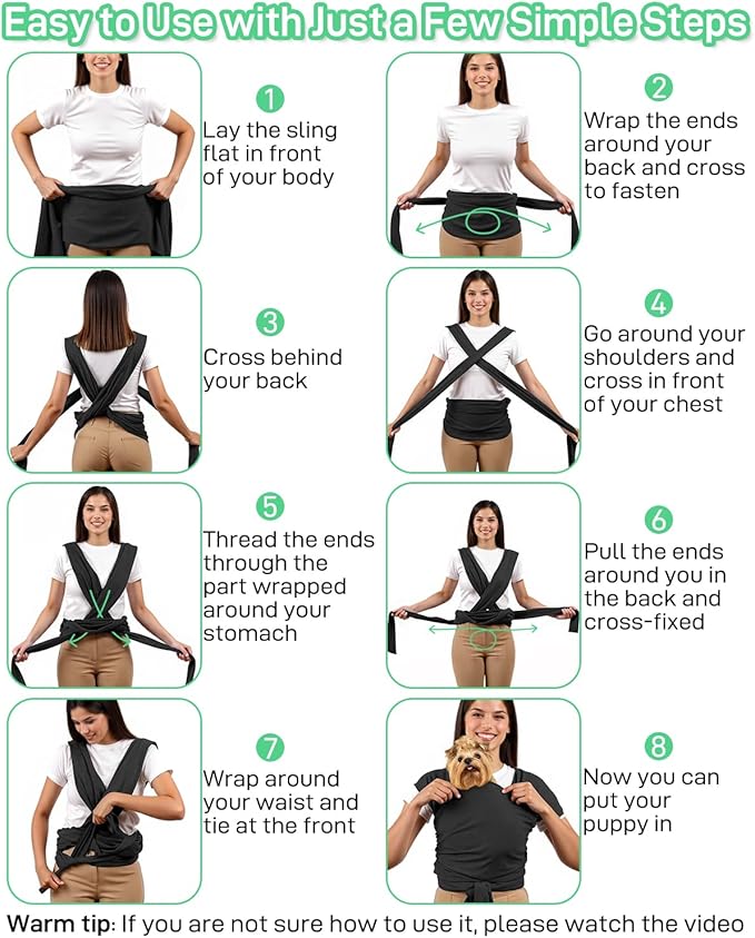 - Easy to wear: Dog carrier sling is accommodate people of different heights and body type. Pets up to 20 pounds are perfectly placed in the pet carrier sling. Detailed usage methods can refer to pictures or videos, package with specific introductions
