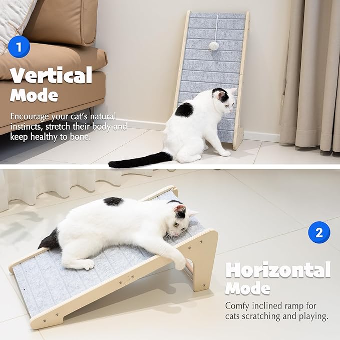 - 2 IN 1 SCRATCHER: 2 ways of placement - Floor mounted ramp or stick against the wall by velcro. Provide a convenient and stable scratching space for cats of all sizes.