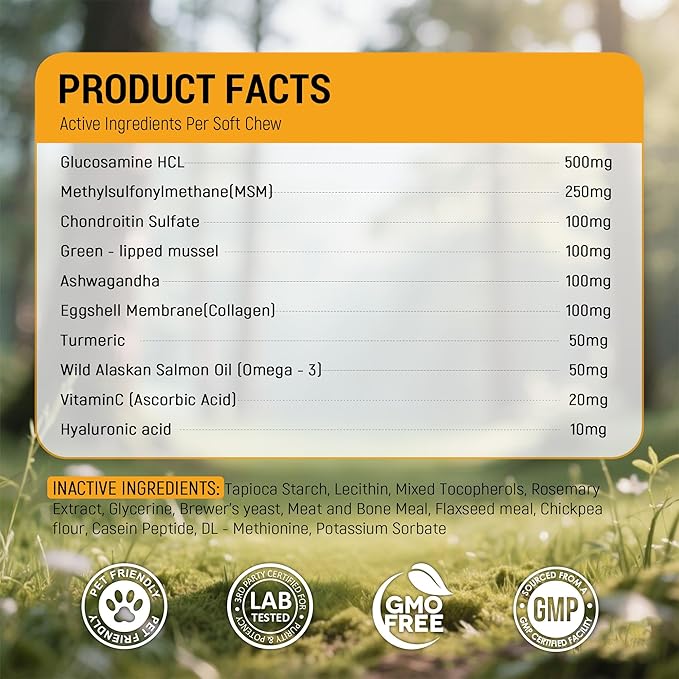 - Natural Green-lipped Mussel for Enhanced Mobility:Sourced from New Zealand's deep sea, green-lipped mussel is rich in natural active ingredients like Omega-3, glucosamine, and chondroitin. Compared with common synthetic ingredients, it's more easily absorbed by dogs, quickly relieving joint discomfort to make your dog's running and jumping more flexible with less stiffness
