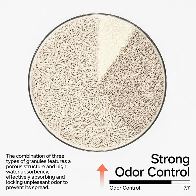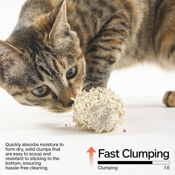 - 【Clumping 7.6】Fast Clumping:Quickly absorbs moisture to form dry, solid clumps that are easy to scoop and resistant to sticking to the bottom, ensuring hassle-free cleaning.
