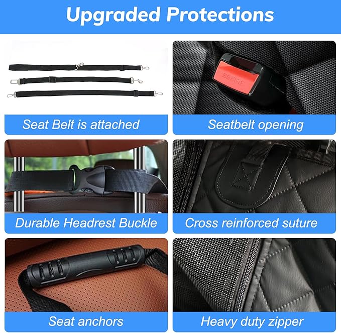 - [Secure, Non-Slip Fit For Safety With Our Back Seat Pet Cover for Dogs] Equipped with anti-slip backing, sturdy seat anchors, and adjustable straps, the backseat cover for dogs in car stays in place even with active dogs, reducing slipping and sliding to ensure a safer ride for both pet and driver