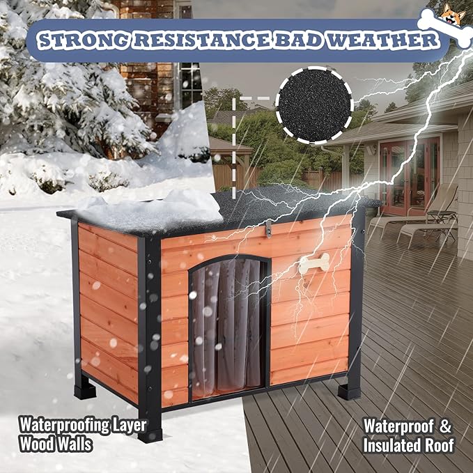 - 【All-Weather Dog House Outdoor for Year-Round Protection:】Built with a sturdy fir wood frame, waterproof asphalt roof, and elevated floor with plastic foot pads, this dog house outdoor shields pets from rain, snow, and ground moisture. Features like weatherproof PVC door curtains ensure durability in any season, making it a reliable sanctuary in extreme conditions.