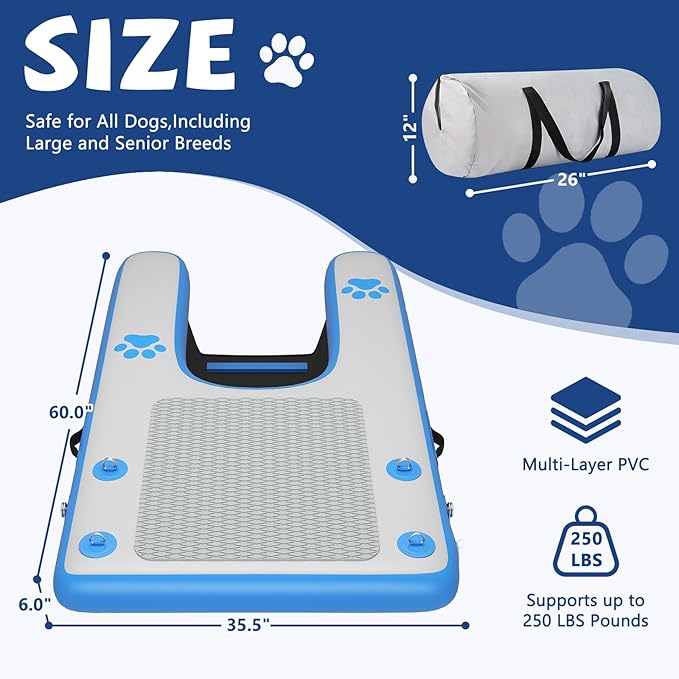 Dog Boat Ramp - Inflatable Dog Pool Ramp for Boat (60" x 35.5"), Non-Slip Water Ladder for Dock, for Pets Up to 250 lbs, Easy Access from Swim Platform, Pool or Floating Docks for Lakes, Blue