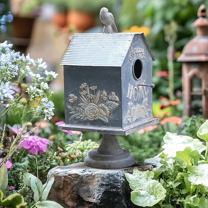 - 【Unique Design】:This birdhouse features a charming vintage - style blue finish, adorned with the words “Happy Home” and intricate floral engravings. A cute bird sculpture on top adds an extra touch of elegance, making it a standout piece in any garden.