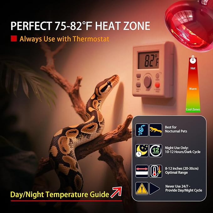 - 【Zero UVB Safe Heating】Reptile heat lamp provides 100% UVB-free infrared heating for nocturnal pets like leopard geckos and ball pythons, safely maintaining ideal 75-82℉ basking temperatures.