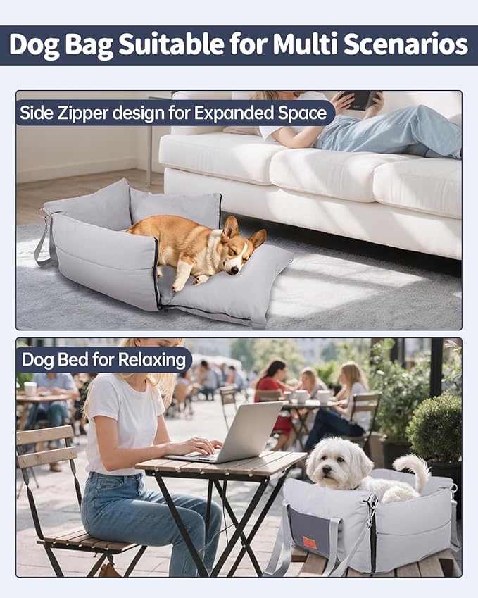 - Versatile Use: With large-capacity storage pockets on 4 sides, this small dog car seat allows for convenient placement of your pet's daily supplies, saving space. You can also detach the safety belt and store it in the pocket, using small dog car seats under 12 lbs as a dog bed at home or outdoors.