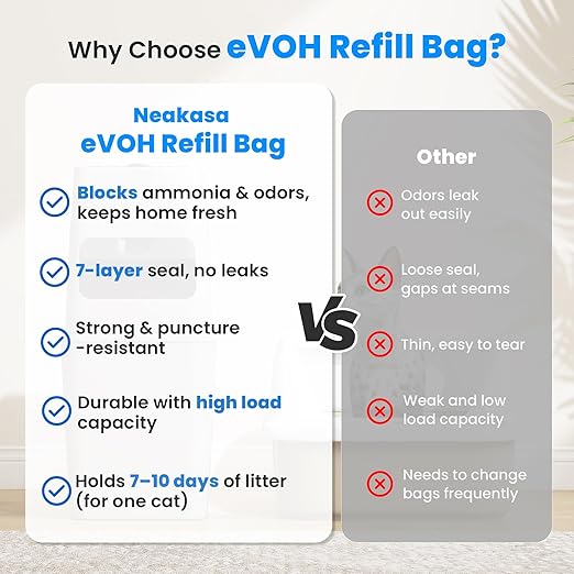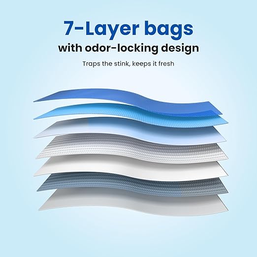 - [Triple Odor Control] Designed with a sealed lid, odor-blocking inner partition, and high-performance 7-layer EVOH bags, this litter bin delivers triple protection against unpleasant smells. The included EVOH liners outperform regular trash bags by effectively locking in odors and preventing them from escaping, keeping your home fresh at all times.