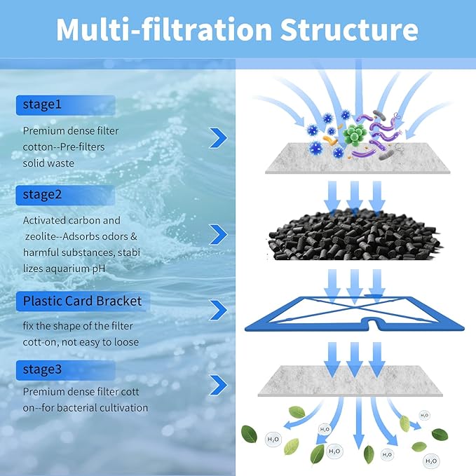 - Efficient Filtration – The fish tank filter cartridge is made of high-quality activated carbon and dense cotton material to effectively trap debris, reduce odors, and maintain crystal-clear water for your aquarium pets.