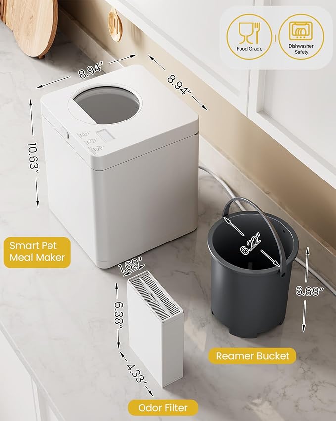 - Low noise, odorless and easy clean:Cooking machine built-in activated carbon filter,machine operates quietly(<45dB) without any smell. Features self-cleaning with high-temperature steam wash and dishwasher-safe removable parts. Make it easier to stick to homemade fresh food. Pet meal maker made with pet-safe, BPA-free materials and food-grade aluminum. Backed by a year warranty.