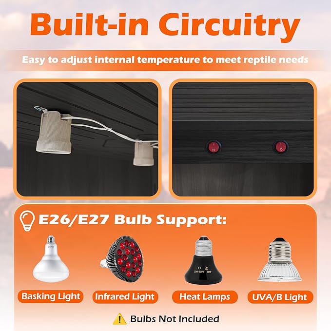 - 【Integrated Lighting System】The built-in electrical setup features lamp holders—2 for the 24"/32" sizes and 3 for the 40"/48" sizes—each with its own switch. This eliminates the need for extra fixtures, reduces setup costs, and keeps wires tidy by only using one wire. Compatible with standard E26/E27 bulbs (not included), the system gives you full control of lighting and temperature to create the ideal habitat for your reptile.