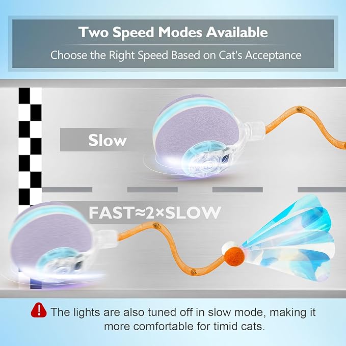 - 【Multi-Surface Performance】The enhanced motor system allows this interactive cat toy to navigate effortlessly across thick carpets, thin rugs, and hardwood floors (note: slight speed reduction on carpeted surfaces). If decreased mobility occurs, follow included instructions to remove hair from mechanical parts for optimal performance restoration
