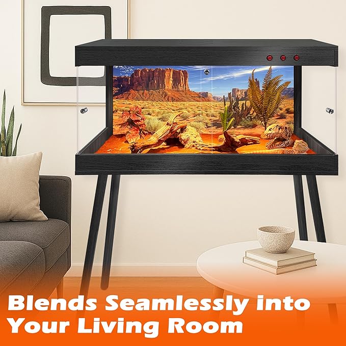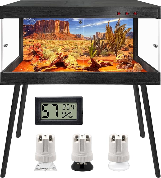 - 【Premium Craftsmanship & Materials】Built with natural wood and strong tempered glass, this reptile terrarium combines strength with a sleek, modern look. The interior is coated with a water-resistant finish for long-lasting use, while the acrylic bottom panel ensures dependable moisture protection against spills and substrate buildup. Its roomy design provides ample space for your reptile to climb, bask, and hide—encouraging natural activity and supporting overall well-being. Available in 4 sizes, each enclosure comes with 4 sturdy legs (see image 2 for detailed dimensions).