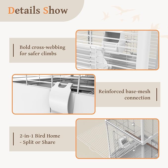- 【2-IN-1 DIVIDABLE DESIGN - One Cage, Two Zones or One Tall Villa】 The ultimate in versatility! This double flight cage features a removable center divider grid. Keep it in to create two distinct living zones—perfect for introducing new birds, managing breeding pairs, or simply giving everyone their own space. Slide it out to instantly transform the cage into a single, towering paradise with immense vertical space.