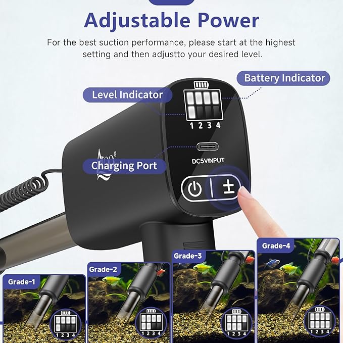 - Powerful Suction with 4 Adjustable Levels: Designed with 4 suction levels, this electric aquarium gravel cleaner lets you easily adjust power to match different tank sizes and cleaning needs. Equipped with a high-performance 8W or 20W full-copper motor, it provides powerful suction to efficiently change water, remove fish waste, uneaten food.