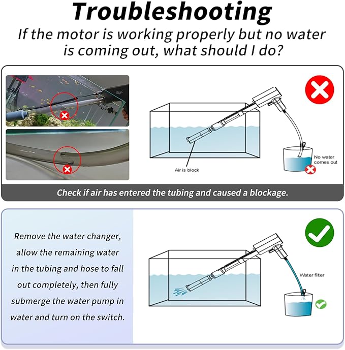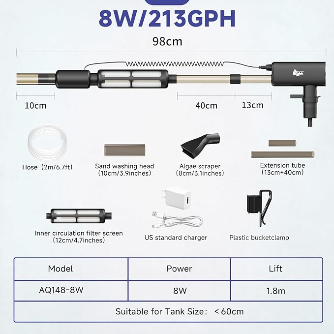 - Aquarium Vacuum with Adjustable Handle: This fish tank gravel cleaner includes a 6.7ft (2m) drain hose and two extension tubes—13cm + 40cm for the 8W model, 40cm + 40cm for the 20W model—reaching up to 30in or 41in. The adjustable handle makes it easy to fit different aquarium heights and water levels, ensuring efficient use as a fish tank vacuum or water changer for small to large tanks