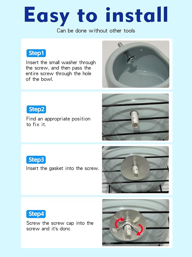 - Hanging Desgin: Secure Cage Attachment – Includes a screw-on mounting system to firmly attach the bowl to wire cages, Hanging mount frees up cage floor space keeping the bowl in place even for active pets. Installation does not require any tools