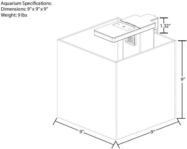 - Aquarium: Approximately 3 Gallons | Dimensions Length 9” Width: 9” Height: 9” | With Filter Inside Tank Total Dimensions: Length 9” Width: 10.5” Height: 10.32” | Weight of Tank: 9 lbs. | Ultra Clear Glass | 5mm Glass Thickness | Beveled and Polished Glass Edges | Signature Black Silicone | Pre-Installed Rubber Leveling Mat