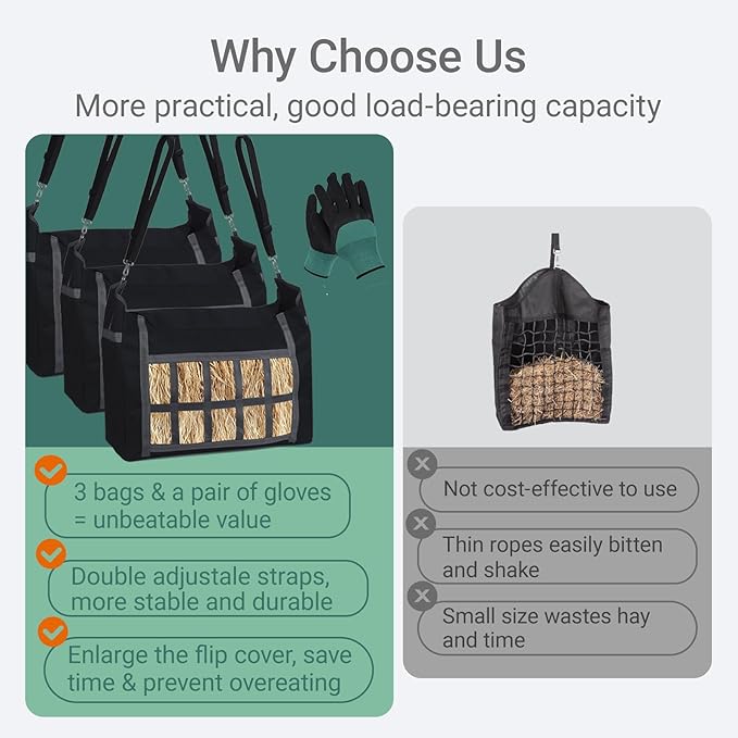 Hay Bags for Horses, 3 Pack Durable Large Capacity Horse Hay Feed Bags with Free Gloves, Slow Feed Hay Feeder for Goats/Sheep/Donkeys, Easy to Hang & Fill with Front Hay Nets Design