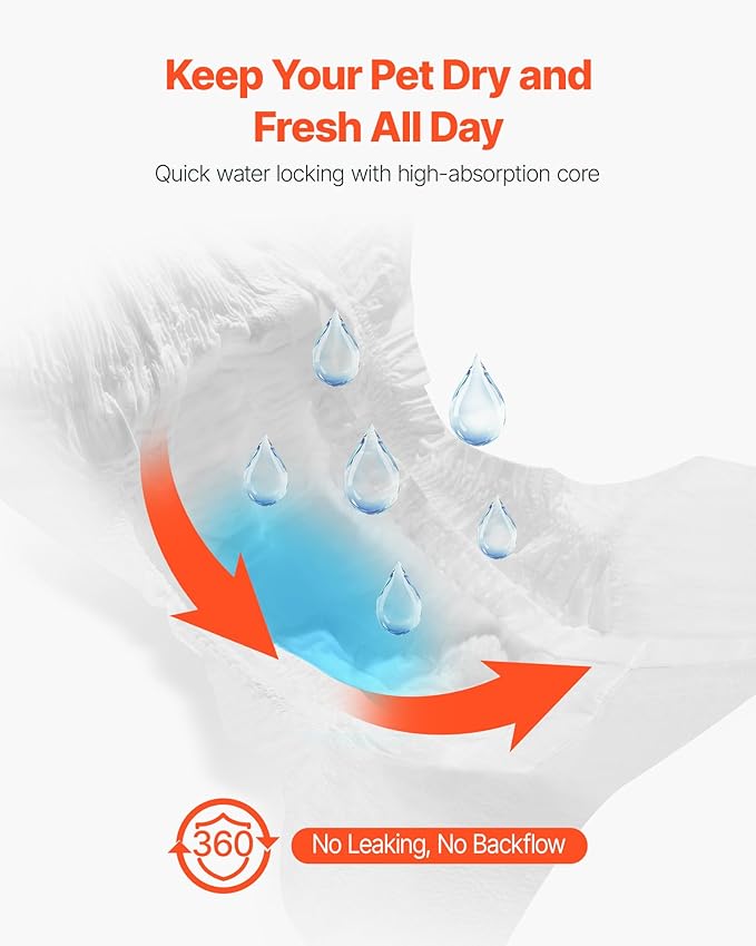 - Super Absorbent: VEVOR M-sized disposable female dog diapers feature a super absorbent core that quickly locks in liquid, offering 360° leak-proof protection with no backflow. Perfect for dogs in heat cycles, pet training, incontinence, post-surgery recovery, and travel. Suitable Waist Size: 15-23 inches / 38.1 - 58.42 cm