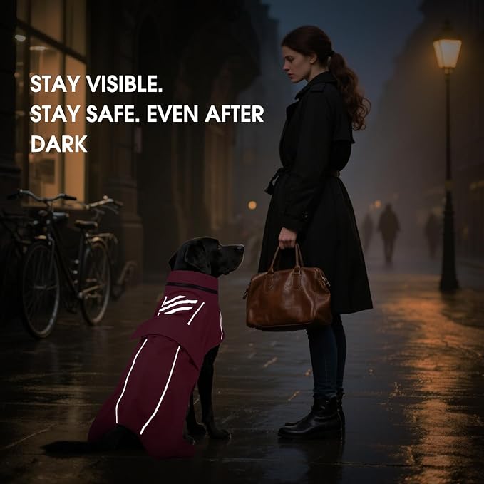 - REFLECTIVE BACK STRIP & LEASH HOLE - BUILT-IN SAFETY FOR NIGHT WALKS - Stay safe during evening strolls with the reflective stripe on the back. The leash hole makes it easy to attach a leash without removing the coat, making this a practical and secure option among dog rain jackets for large dogs and dog raincoats for large dogs with hood.