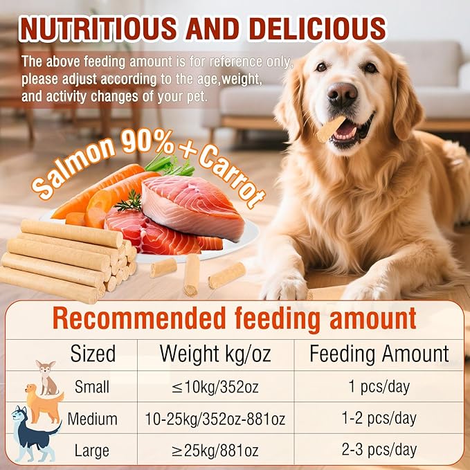 - 【Dental Care Benefit】Not only are these salmon sticks dog treats tasty,but they also promote dental hygiene.Chewing on our salmon sticks helps to clean your dog’s teeth,making it a perfect option for oral health.