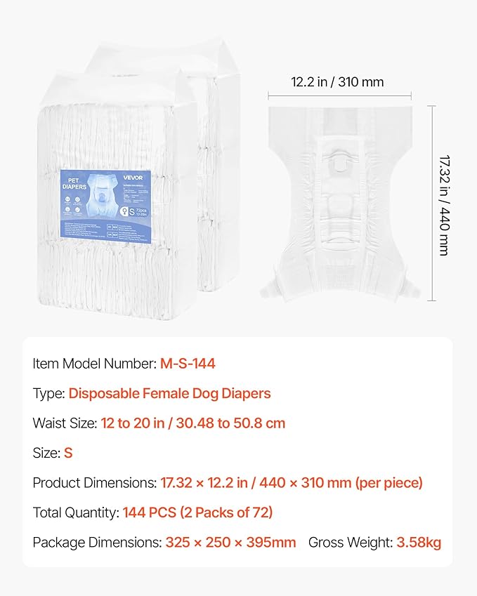 - Super Absorbent: VEVOR S-sized disposable female dog diapers feature a super absorbent core that quickly locks in liquid, offering 360° leak-proof protection with no backflow. Perfect for dogs in heat cycles, pet training, incontinence, post-surgery recovery, and travel. Suitable Waist Size: 12-20 inches / 30.48 - 50.8 cm