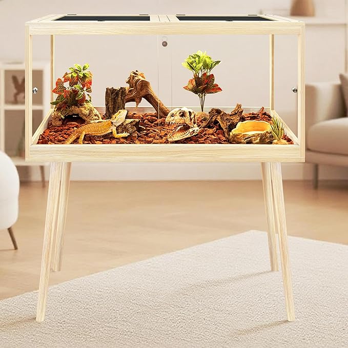 - 【Spacious Elevated Design】Available in 24", 30", 36", and 48" lengths with a raised 4-legs design(please refer to pic2 for exact size), this habitat offers ample room for reptiles to explore, bask, and hide. Refer to the second image for detailed sizing to select the best fit for your pet. The bottom includes an acrylic liner that makes cleaning easier while keeping the interior tidy.