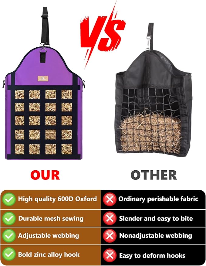 - 【Heavy-Duty 600D Oxford Hay Bag - Built to Last】Made with premium 600D oxford fabric, this hay bag is tough as nails! The heavy-duty stitching stands up to daily wear, tears, and even those cheeky horse nibbles. Say goodbye to flimsy feeders—this bad boy is built for the long haul, so you can trust it to hold up ride after ride.