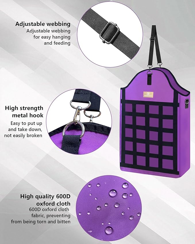 - 【Easy Hanging & Adjustable for Any Setup】No fuss, all function! The heavy-duty adjustable straps with durable metal hooks let you hang this bag anywhere—trailers, stalls, or paddocks. Customize the height in seconds to fit your horse, goat, or donkey—because one size shouldn’t have to fit all.