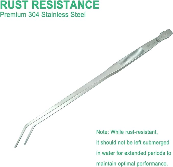 - √【PREMIUM 304 STAINLESS STEEL CONSTRUCTION】Crafted from high-quality 304 stainless steel, our aquascape tool boasts exceptional rust resistance, ensuring long-lasting durability even in humid aquarium or terrarium environments. Its corrosion-proof property makes it a reliable tool for both freshwater and saltwater tank maintenance, as well as damp reptile habitats. Note: While rust-resistant, it should not be left submerged in water for extended periods to maintain optimal performance.